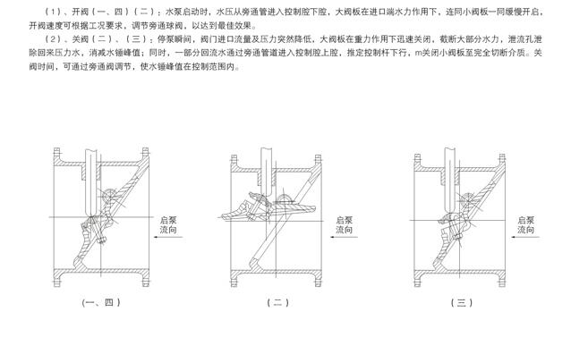 當水泵啟動后進口端水經過、過渡器、截止閥、高壓管、進入膜片缸下部,在水的壓力下推動膜片關上行帶小閥板緩慢開啟,大閥板在水力的推動下與小閥板同時開啟,完成開閥。